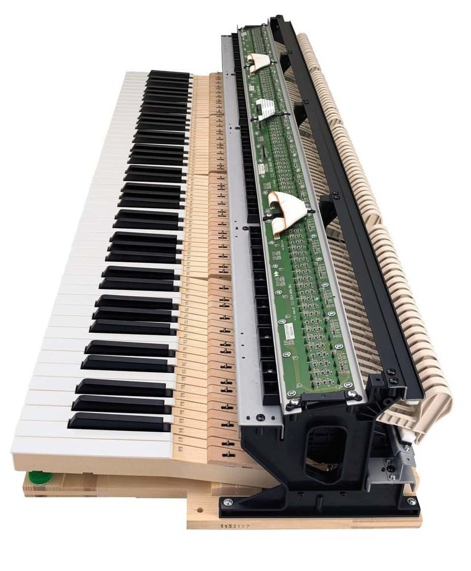 L’un des meilleurs hybrides du moment avec le toucher d’un vrai C.Bechstein !! Nouveauté fin 2019, les nouveaux modèles de la série GP de Casio tiennent plus que leurs promesses ! Élaboré en collaboration avec l’allemand Bechstein qui a entre autre fourni les claviers en bois, le GP-310 propose 35 sonorités dont 3 très belles de pianos à queue, dénommées “Berlin”, “Hambourg” et “Vienne” derrière lesquelles on identifie les prestigieuses marques Bechstein, Steinway et Bösendorfer… le GP-310 vous permet en plus de choisir un type d’ambiance et d’époque particulières pour mieux baigner dans l’atmosphère des œuvres que l’on décide d’aborder. Le couvercle se relève et laisse voir une véritable mécanique à marteaux qui, couplée au clavier en bois naturel, propose de belles sensations de jeu au pianiste. L’amplification est de qualité et distille des tessitures plutôt veloutées et classiques. Le couvercle se relève en libérant plus de volume et en laissant voir l’action des marteaux et de la mécanique. La volonté de Casio est claire sur ce produit : proposer un instrument le plus proche possible du piano, sobre d’apparence, disposant de peu de fonctions mais toutes de qualité, et d’une utilisation simple et instinctive. L’objectif est atteint, le piano est vraiment bluffant à jouer. Il comblera tout pianiste exigeant en quête d’un instrument de haute qualité. Les fonctions d’enregistrement sont vraiment agréables pour les pianistes désirant se réécouter ou jouer seul du 4 mains ! La finition noir brillant est d’un chic absolu… Sa version laquée haut de gamme, le GP-510, a été récompensé par le magazine Diapason d’un Diapason d’or.